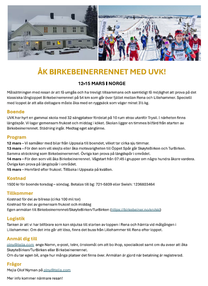 MEDLEMSBREV - AUGUSTI 2025 Årsmöte: Årets årsmöte hölls i början av maj på Arenahotellet. Vi fick då in ett nytt namn efter att Tomas Lundin tackat för sig. I Verksamhetsberättelsen för 24/25 kan ni läsa om alla aktiviteter vi genomfört under året. Styrelse för 25/26: Ordförande: Stefan Djurström Kassör: Kennet Fredriksson Ledamöter: Linnea Djurström, Anders Edberg, Lovisa Svensson (Sekr.) och Magnus Träff (V.ordf). Ersättare: Stefan Andersson och Josef Mård (nyvald) Revisorer: Åsa och Olof Nyman Medlemsavgift: Medlemsavgiften beslutades oförändrad, 400kr/medlem och gratis för barn under 20år. I vårt medlemshanteringssystem (laget.se) går det tyvärr inte att hantera familjemedlemskap. Inbetalningsuppgifter kommer under september. Veckans träning: Våra träningspass fortsätter tillsvidare i avvaktan på snön. Träningarna håller på för fullt med rullskidor, skidgång/löpning och cirkelfys. Info om veckans aktiviteter hittar ni på UVK:s facebooksida och www.uppsalavasaloppsklubb.se. Alla träningar är anpassade så alla ska kunna vara med oavsett förmåga. Ta chansen att vara med, mycket roligare att träna i grupp! Inför vintersäsongen: Vi kommer snart att starta upp med "Veckans Ski-erg"-pass igen. Uppsala Vasaloppsklubb har en egen grupp på Facebook ("UVK Ski-erg grupp") samt kommer att lägga ut ett pass i veckan direkt i Ergzone. För mer info eller om man behöver hjälp att komma igång så kontakta Anders Edberg. Vi kommer i år att lägga lite extra fokus på utvalda seedningslopp där vi kommer lägga upp evenemang för utbyte av vallatips, förslag på boenden, möjliggöra samåkning med mera. Håll koll på våra sociala medier! Klubbkläder från Trimtex: Innan vintersäsongen kommer du kunna beställa våra klubbkläder från Trimtex. Länkar till shopen och information om hur man beställer finns på Facebook och på hemsidan när det är dags. Klubbmästerskap: På rullskidor för klubbens medlemmar kommer äga rum 14/9 mellan Nåntuna och Vindbron. Ett roligt inslag där vi hoppas att så många som möjligt vill vara med. Alla ska kunna vara med oavsett nivå! Inbjudan och mer info om det finns på vår Facebook-sida. Kyrkserien: Årets kyrkserie arrangeras tillsammans med Storvreta IK och IK Rex. Det brukar vara väldigt uppskattade träningstävlingar där alla kan vara med. Lager 157 - Ski on tour: Vi har glädjen att bjuda in våra medlemmar till en kväll tillsammans med Lager 157 Ski Team, torsdagen den 18/9 klockan 18:00. En riktigt bra tillfälle för att få inspiration inför hösten och vintern! Vi kommer att hålla till på en lokal ute vid Ultuna (Ulls väg 29C, Uppsala). Ifrån Lager 157 så kommer Marcus Laggar, Anton Järnberg samt åkare (TBA). Mer info och hur ni anmäler er finns på Facebook och hemsida. Orsaläger: Vinterns skidläger i Orsa Grönklitt kommer äga rum 15-18/1. Vi har 42 platser fördelat i 8-10 bäddsstugor. Kostnad 1700kr/person. Mer information om anmälan hittar ni i inbjudan "UVK Orsa-läger 2026" under dokument på hemsidan. Vasaloppsresa: Vi kommer även i år ha buss och boende till Vasaloppet 2026. Anmälan och mer info hittar ni i inbjudan "UVK Vasaloppet 2026" under dokument på hemsidan. Birkebeinerrenet: Mellan 12-15 mars 2026 kommer vi arrangera en resa till Norge för att delta i Birkebeinerrenet. Mer info om resan och hur du anmäler dig hittar du i "UVK Birkebeinerrennet 2026" under dokument på hemsidan. Med hopp om massor av snö och skidspår i vinter! Styrelsen Uppsala Vasaloppsklubb